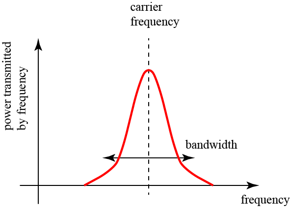 That is: since we have now modulated our carrier wave, it has a range of frequency components centered on the carrier frequency. The width of this range is called the bandwidth, referred to the width of the “band” of frequencies that our signal consists of. If we transmit a 20 kHz audio signal, we expect a bandwidth of around 20 kHz.