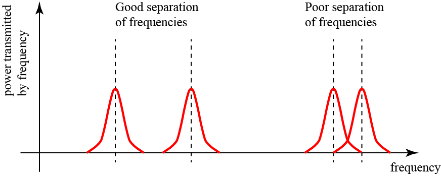 If frequency bands overlap, when you listen to one channel you’ll hear a little bit of the other, in what is known as crosstalk. The only other way to distinguish radio signals is by distance, as a radio transmission can typically only be recovered over a finite distance from the transmitter. If you’ve ever been on a road trip, and were listening to one radio station as it got fainter and fainter and started to hear another one on top of it, you’ve experienced this: you were between two distant radio stations which had similar carrier frequencies.
