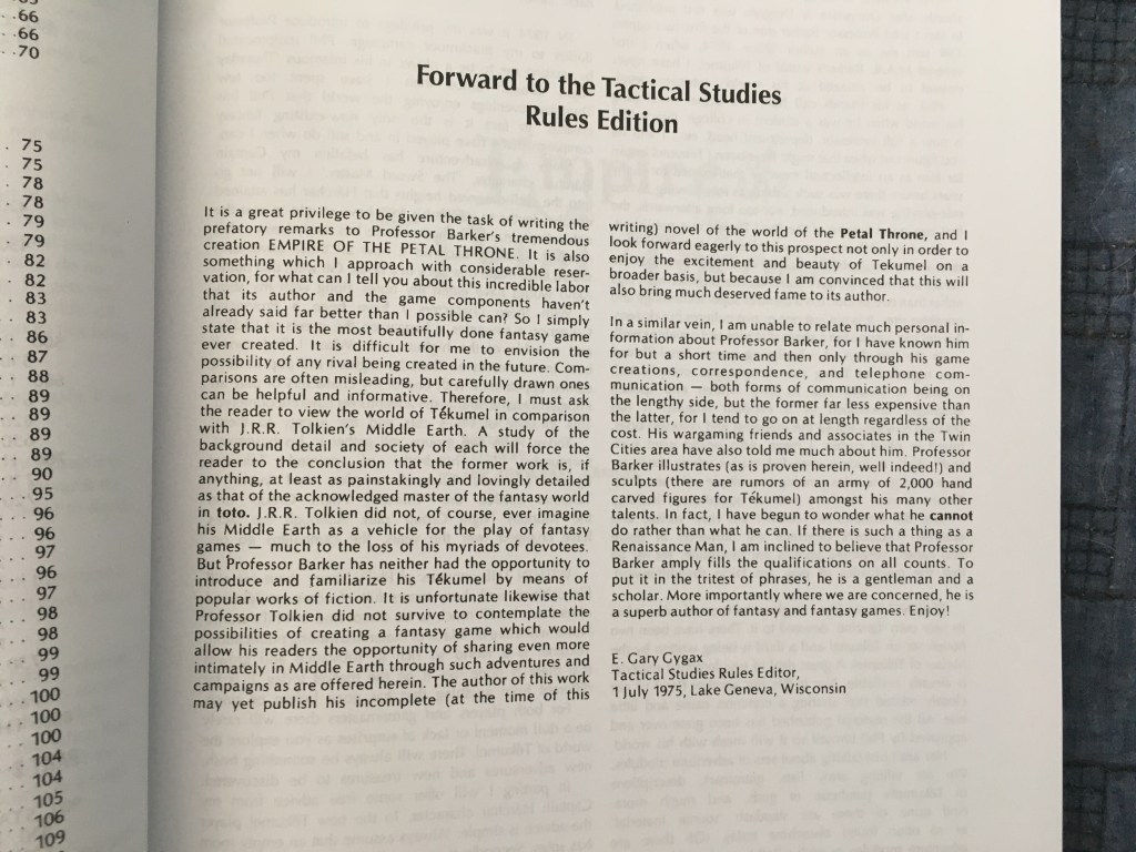 Barker’s setting was originally just a literary pursuit, but he also advised the University of Minnesota’s wargaming club, and in 1974 he was introduced to a new-fangled type of game, called “Dungeons & Dragons.” He quickly created his own game, Empire of the Petal Throne, set in his world of Tékumel, with rules strongly inspired by D&D. He self-published his new game in a 50 copy printing, but quickly drew the attention of Gygax and Arneson at TSR, who published a TSR edition of the game with a glowing introduction by Gygax himself.
