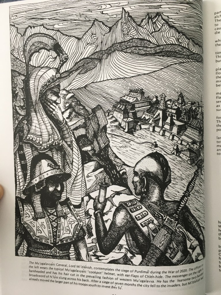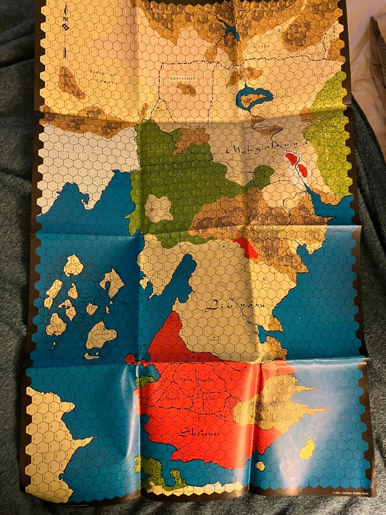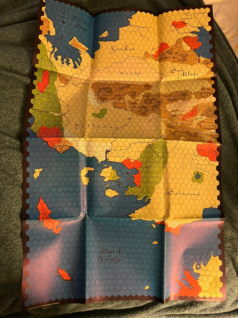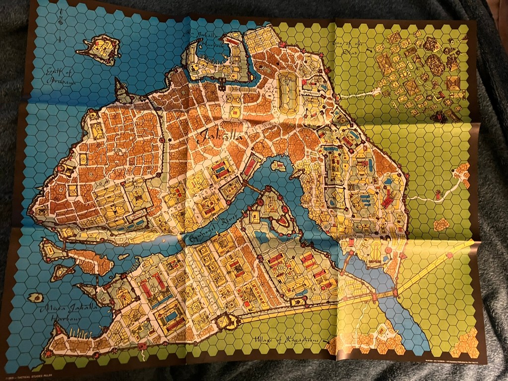 But having an original edition has its benefits. When I first shared on social media that I had secured a copy, several people immediately asked if the maps are present. They are, and I can see why they asked: the maps are gorgeous and of an exceptional quality. Printed on thick flexible cloth-like paper, they seem as good as new even though they are now almost fifty years old! Here is the map of Jakalla, the capital city of the Jakasha Province: