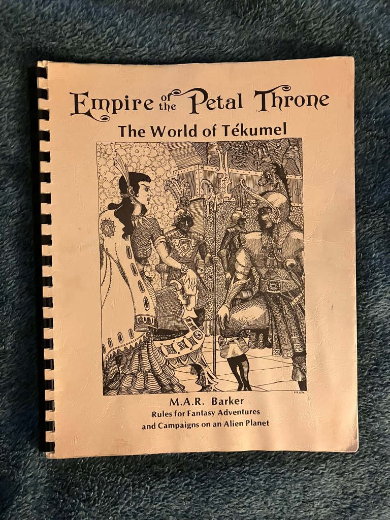 Now I want to do a shoutout to one of the oldest of RPG products, and one of the hardest to find in the wild! I am talking about the (almost) original edition of Empire of the Petal Throne, published by TSR in 1975. I have previously said, jokingly (I hope), that I would kill someone to get a vintage copy of this game; this summer, when I got a nice performance bonus, I decided to just go ahead and get one for myself, which was not cheap but not as expensive as you might think!