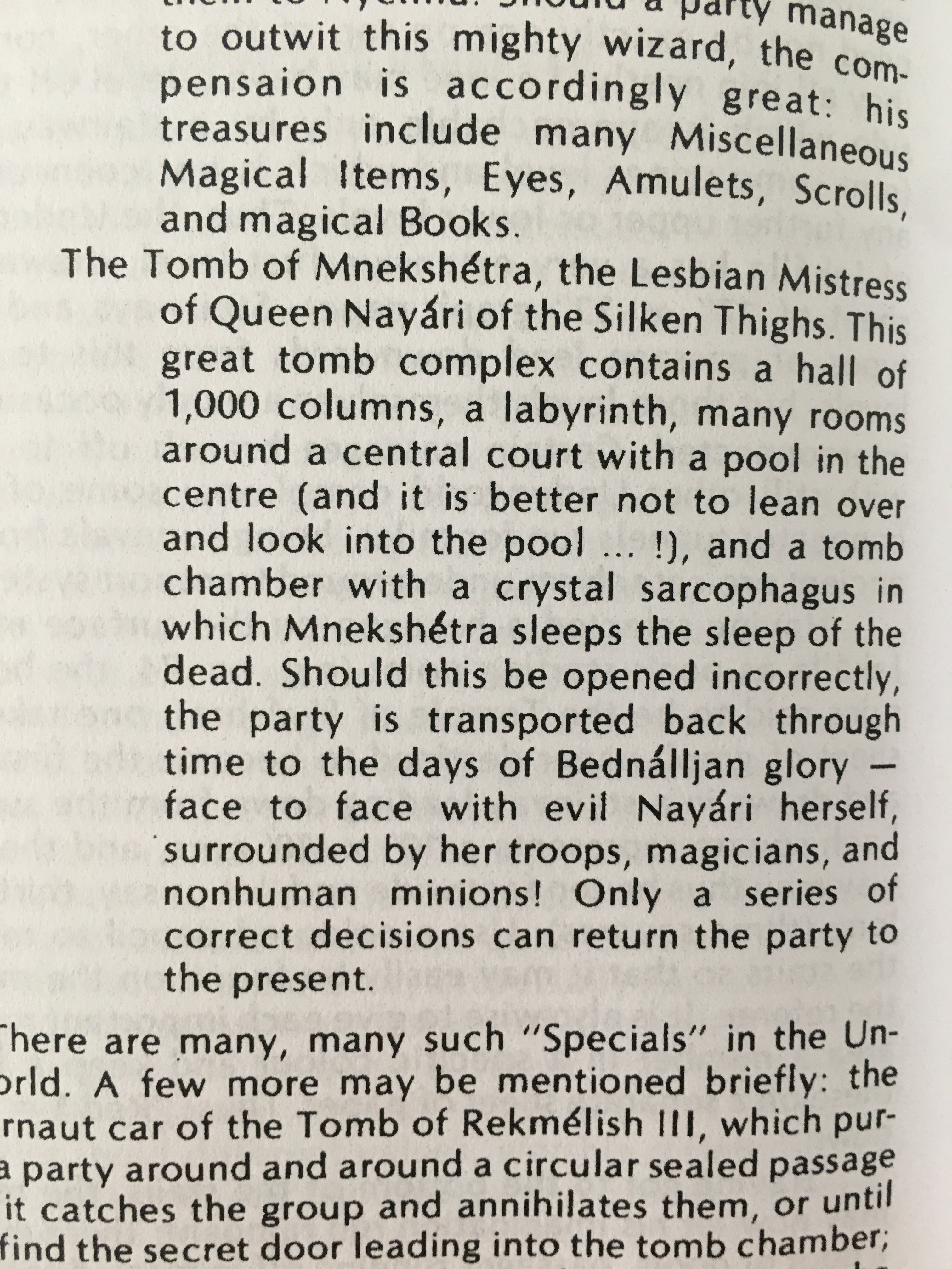 Dungeons include remnants of the lost technological civilization, as well as more recent (but still ancient) tombs and underground cities of Tékumel. This example from the book may be the first mention of homosexuality in a roleplaying game?