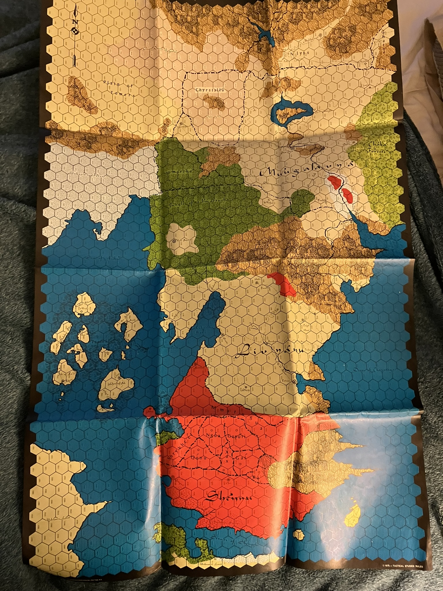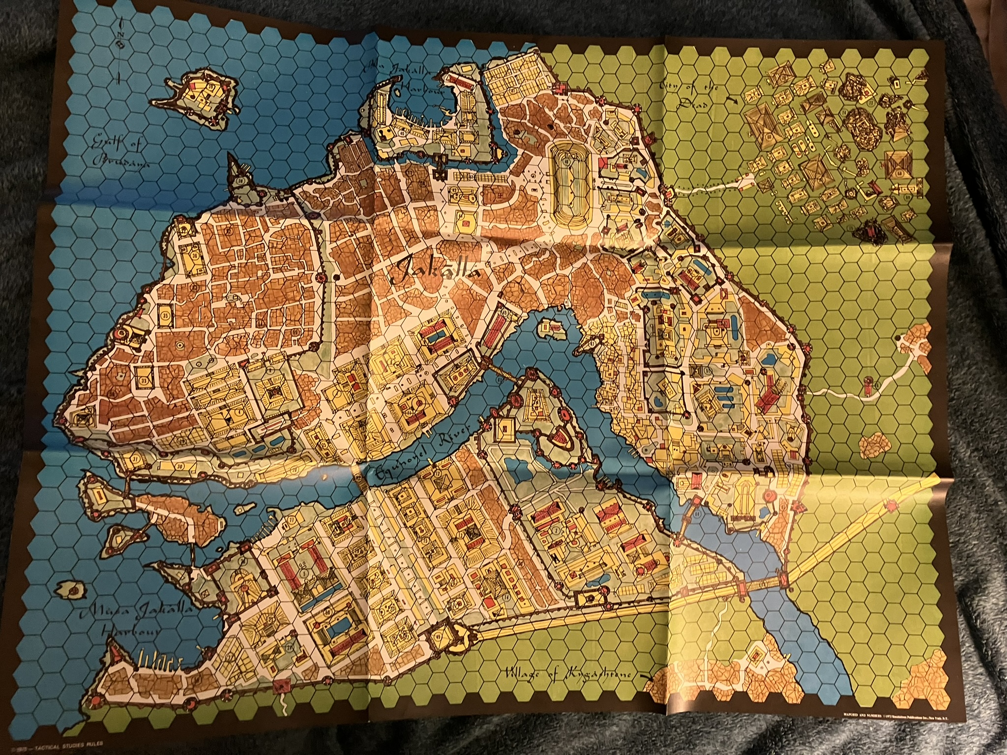But having an original edition has its benefits. When I first shared on social media that I had secured a copy, several people immediately asked if the maps are present. They are, and I can see why they asked: the maps are gorgeous and of an exceptional quality. Printed on thick flexible cloth-like paper, they seem as good as new even though they are now almost fifty years old! Here is the map of Jakalla, the capital city of the Jakasha Province: