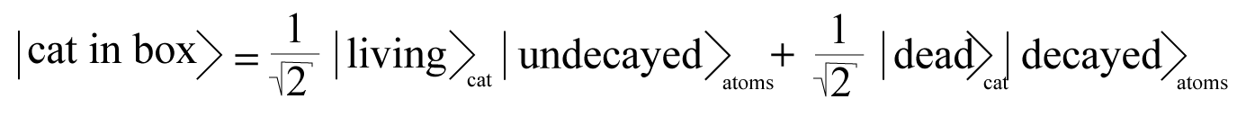 A living cat is put into a box with a radioactive source, and a radiation detector will release poison gas if a radioactive decay is detected. If the setup is designed so that there is a 50% chance that a radioactive decay occurs in a certain time, then at that time the Copenhagen interpretation of physics suggests that the cat and the radioactive source will be entangled, with a quantum state of the form