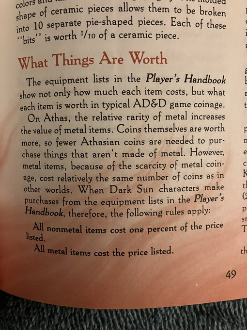 Metal is scarce on Athas, and ceramic pieces tend to be used as currency. Much of the exploration of ruins is motivated by finding metal to be made into weapons.