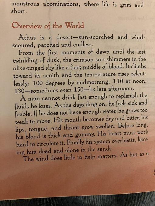 The world of Athas is detailed in The Wanderer’s Journal, and much of it is a merciless desert, reaching perhaps 150 F in the day and dropping to freezing at night.