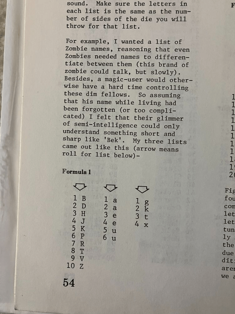 The book also includes guidelines for generating your own style of names, with an example from the author that he used for generating zombie names. He imagined a class of semi-intelligent zombies who have simple, three-letter names.