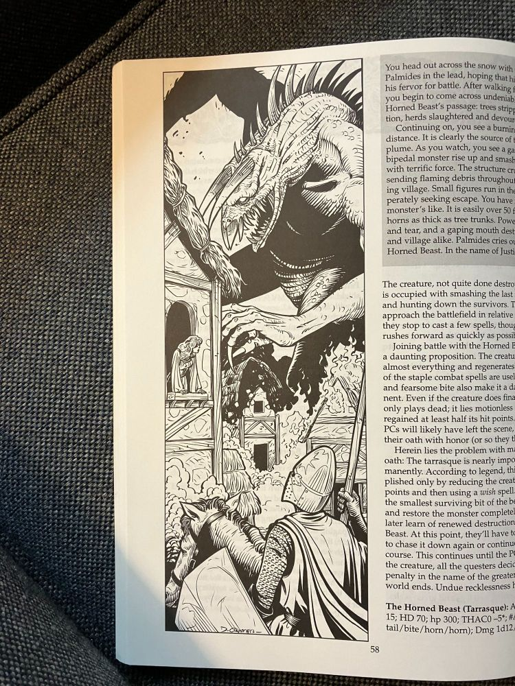The adventure amounts to playing a dirty trick on the players. An object called the Stone of Corbinet has long served as the foundation of reality, guarded by a loyal family. Now an outcast from that family tricks the characters into stealing the stone, setting the end of the world in motion. The trick is to make the characters think they’ve won by acquiring the Stone and passing it to someone they think is divine, and then let them play another adventure before the world starts to come apart, with hideous monsters like the classic kaiju-like Tarrasque rampaging.