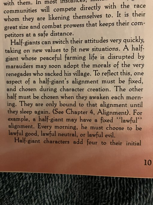 Giants have an additional quirk: they are known to change their attitudes regularly. To reflect this, one half of a giant’s alignment is fixed (for example, “Lawful”) and the other half is chosen anew every day (like “good,” “neutral,” or “evil.”)