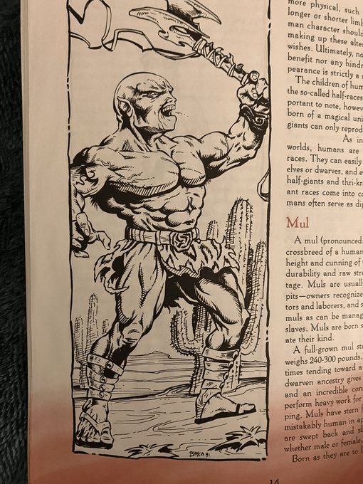 Players may also play half-dwarf, half-human breeds, known as “Muls.” They are strong and have incredible endurance, and are often used as worker slaves for their durability. (Slavery is one aspect of the setting that has gotten more awkward as time has passed.)