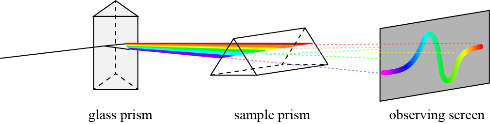 Kundt also created an absolutely gorgeous way to experimentally study the phenomenon of anomalous dispersion, which also was the inspiration of this post! His method is known as the method of crossed prisms, and it is, in essence, exactly what the name says.