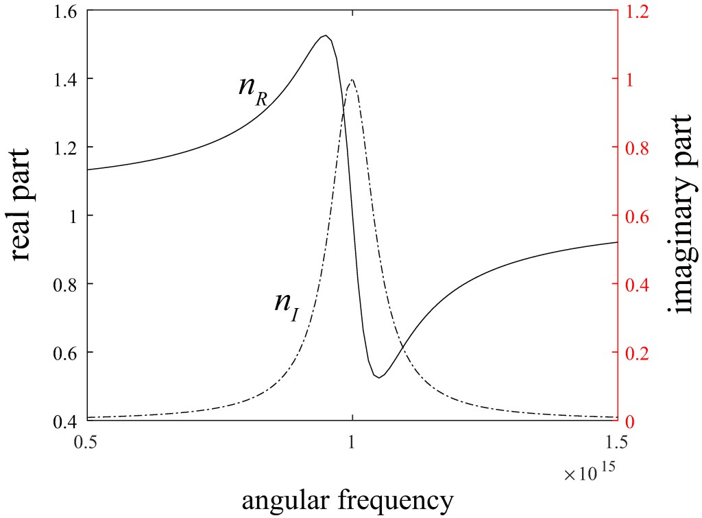 For purposes of this blog post, one big question remains: what is the origin of this sharp change of refractive index, this anomalous dispersion, around the absorption lines? By Wood’s era, the question had already been at least partly answered by the Dutch scientist Hendrik Antoon Lorentz. In the late 1800s, he introduced a simple model of an atom to describe light-matter interactions. In short, he assumed that electrons are trapped in the neighborhood of atoms by a simple harmonic oscillator force, like the force a spring exerts. A simple harmonic oscillator oscillates at a fixed frequency that is determined by the mass of the electron and the force of the spring. Further assuming that the electron oscillations are damped, i.e. that they lose energy as they oscillate, he was able to produce a model for the refractive index of a material near an absorption line that matched the experimental observations of anomalous dispersion stunningly well. An image of the theoretical refractive index nR and the strength of absorption nI around an absorption line is shown below. Looking at the refractive index and comparing it to Wood’s photograph above, you can see the striking similarity between the images. In both cases, the refractive index shoots up as one approaches the resonance frequency, then it plummets across that frequency and then shoots back up on the other side. Wood and others could not see the “plummet” because it occurs at frequencies where light is strongly absorbed.