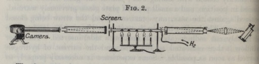 I don’t want to dwell on the details of Wood’s results, but rather the way he depicted them. Wood had a tools available that were relatively new to the scientific community: photographs and color plates. He also introduced a modified experimental setup to produce cleaner results; his illustration is given below.