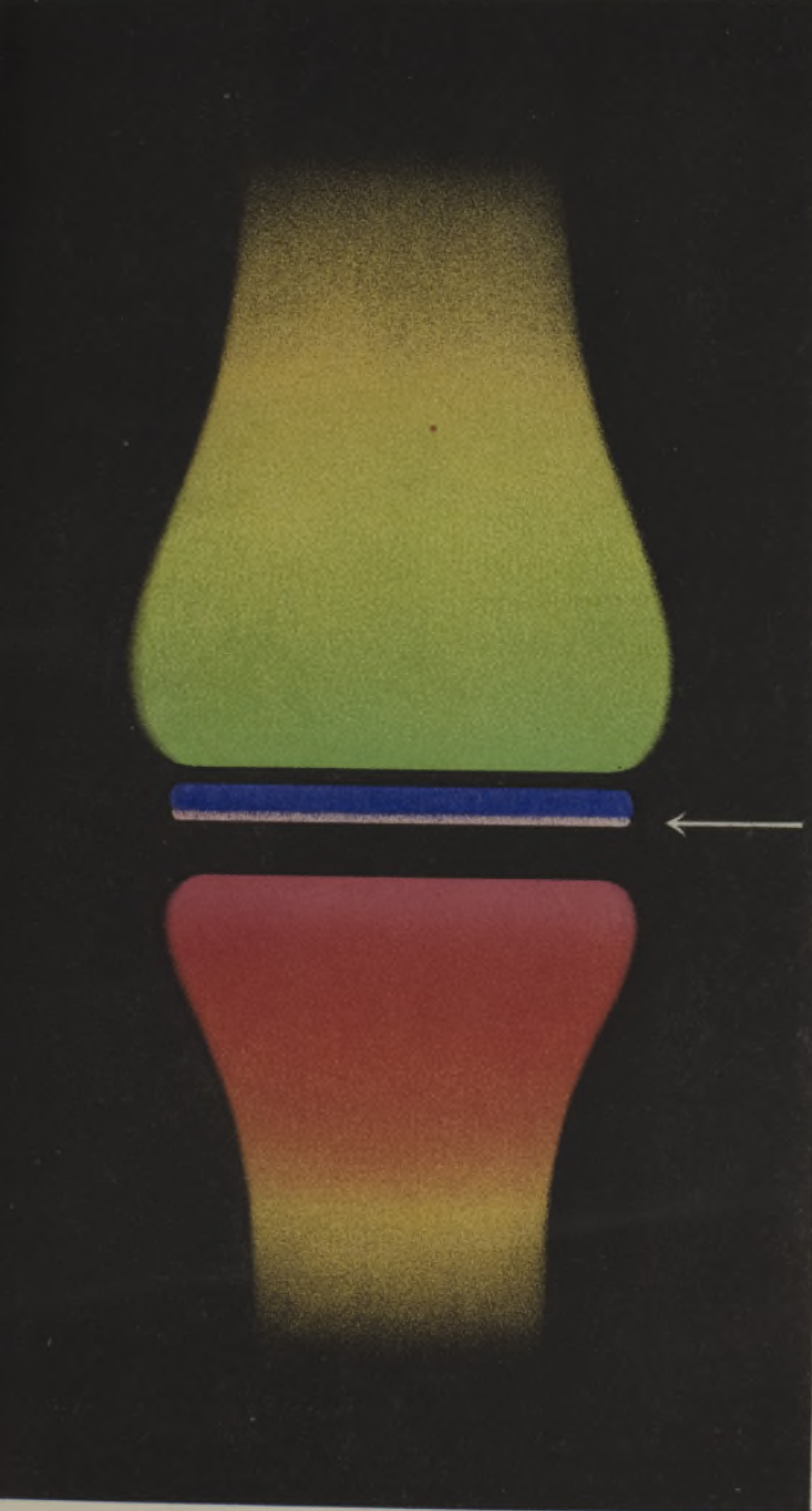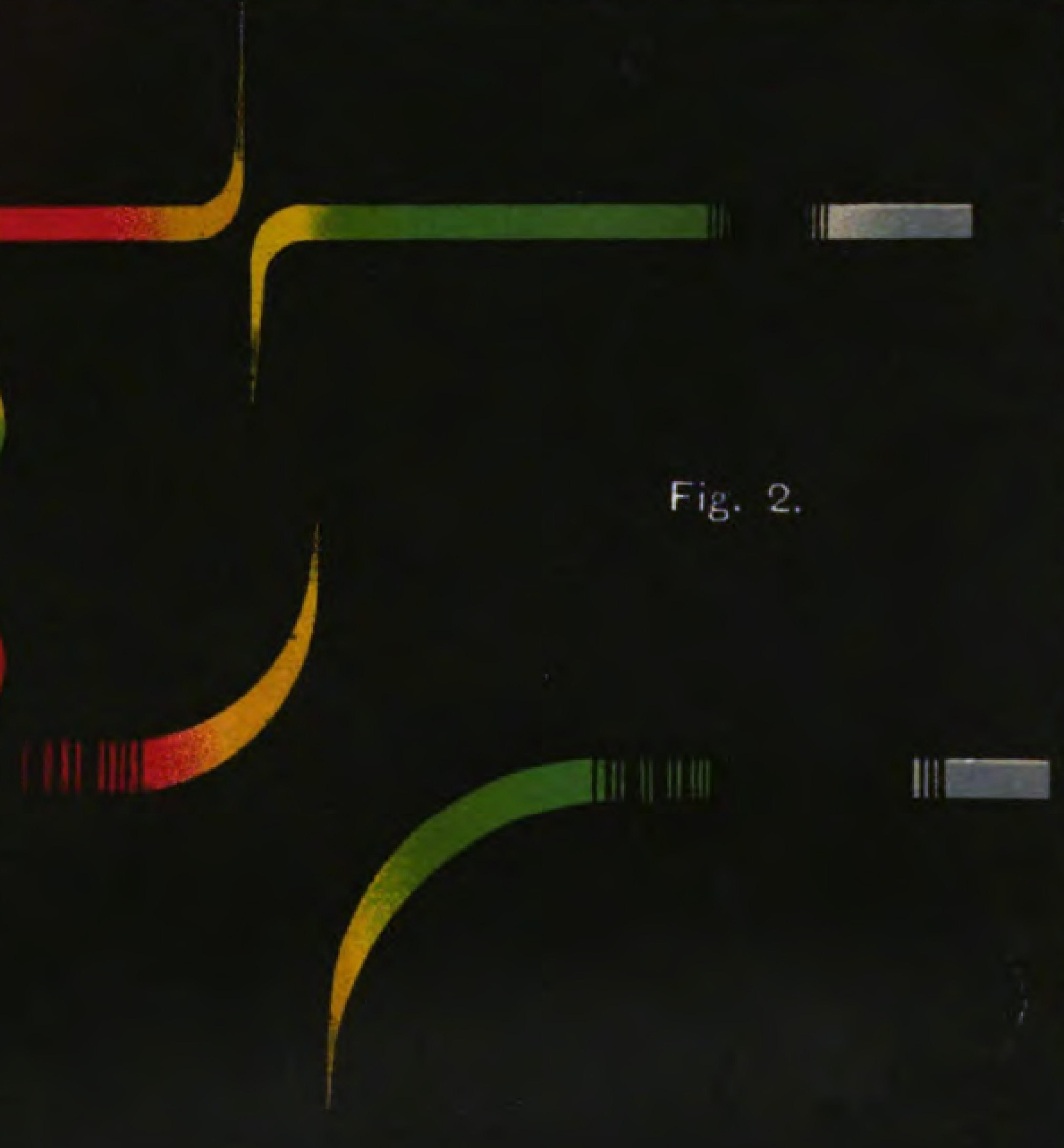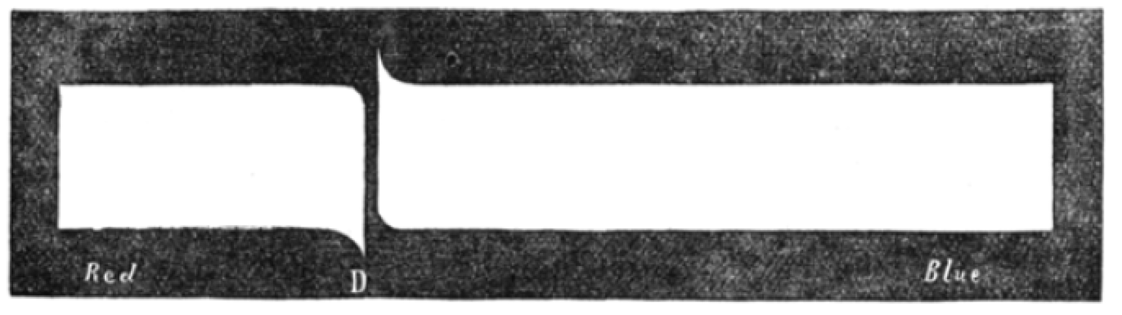 This drawing is in essence a rough map of the refractive power of different colors. The center violet band matches the slit and indicates that the refractive index is nearly that of vacuum. Red, below the center, suggests a lower index, while green suggests a higher one. The drawing is only an approximation of what Wood was seeing in the lab; as he said, “it is quite impossible to represent by means of pigments the sparkling brilliancy of the colours.”