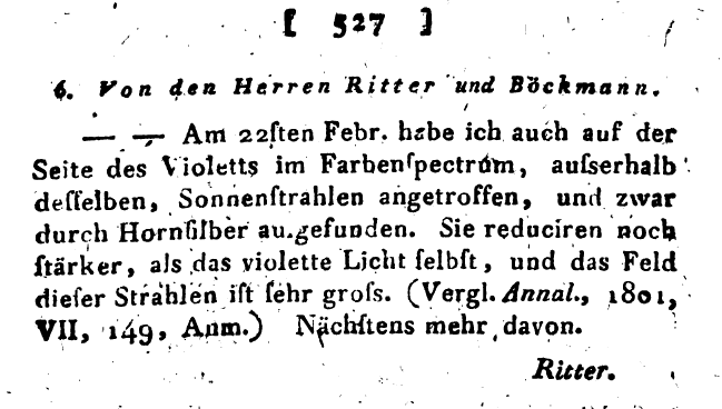 On 22 February, I also encountered rays alongside violet in the colour spectrum of colours—outside it—by means of horn silver. They reduce even more strongly than violet light itself, and the field of these rays is very wide (cf. Annal[en der Physik], 1801, VII, 149, note). More to come soon. Ritter.