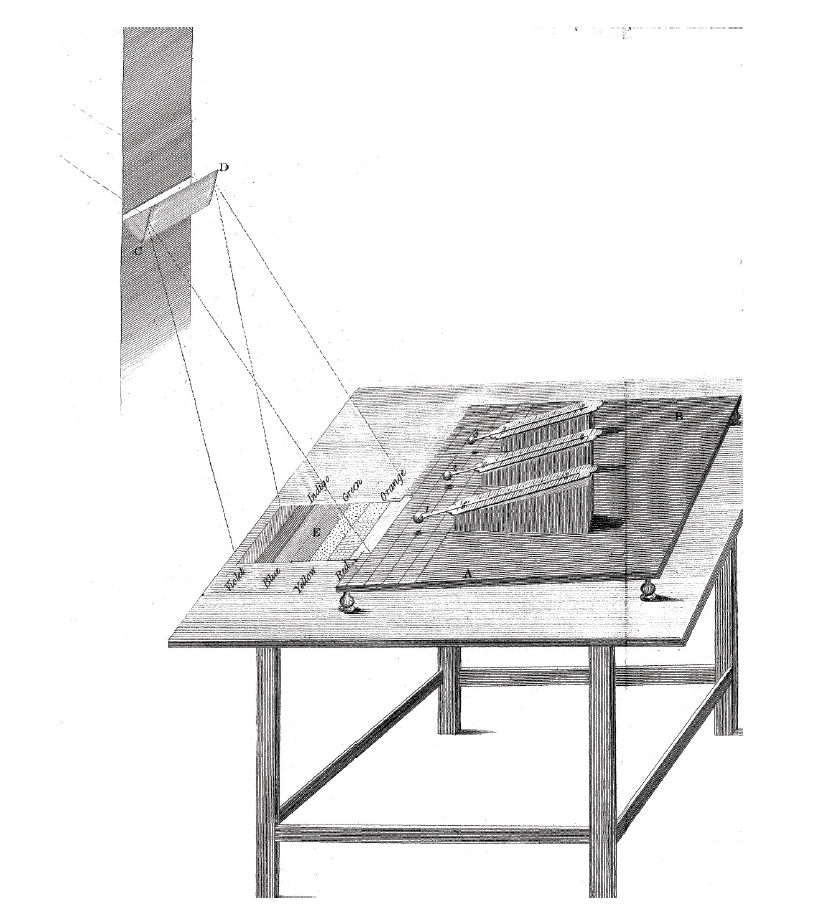 In particular, red-colored filters blocked a lot of light, but seemed to let lots of heat through. This led Herschel to perform a series of experiments to study the heating and illumination powers of the different colors of sunlight. He set up a simple and ingenious method to test the heating powers: he separated collimated sunlight into its different colors using a prism, and successively put a thermometer bulb into each color to see how much it raised the temperature. His original illustration of this experiment is shown below.