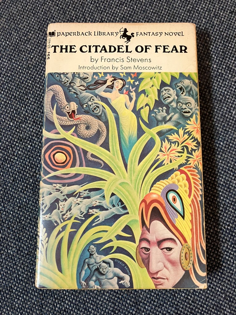 I definitely underestimated Francis Stevens on this one. Stevens was the pseudonym of Gertrude Barrows Bennett (1884-1948), an author of fiction that now tends to fall under the label of “dark fantasy.” Quite a long time ago, I read a complete collection of her short fiction and followed up with her 1920 novel Claimed!, about a man who stubbornly refuses to return the possession of a dark power of the seas. Looking back on those blog posts, that were written some 15 years ago, I found Stevens’ work enjoyable but not exceptional. At the same time, I picked up a vintage copy of her novel The Citadel of Fear, first published in 1920, but somehow didn’t get around to reading it at the time. You can see from the gorgeous cover art why this 1970 edition of the book caught my eye.