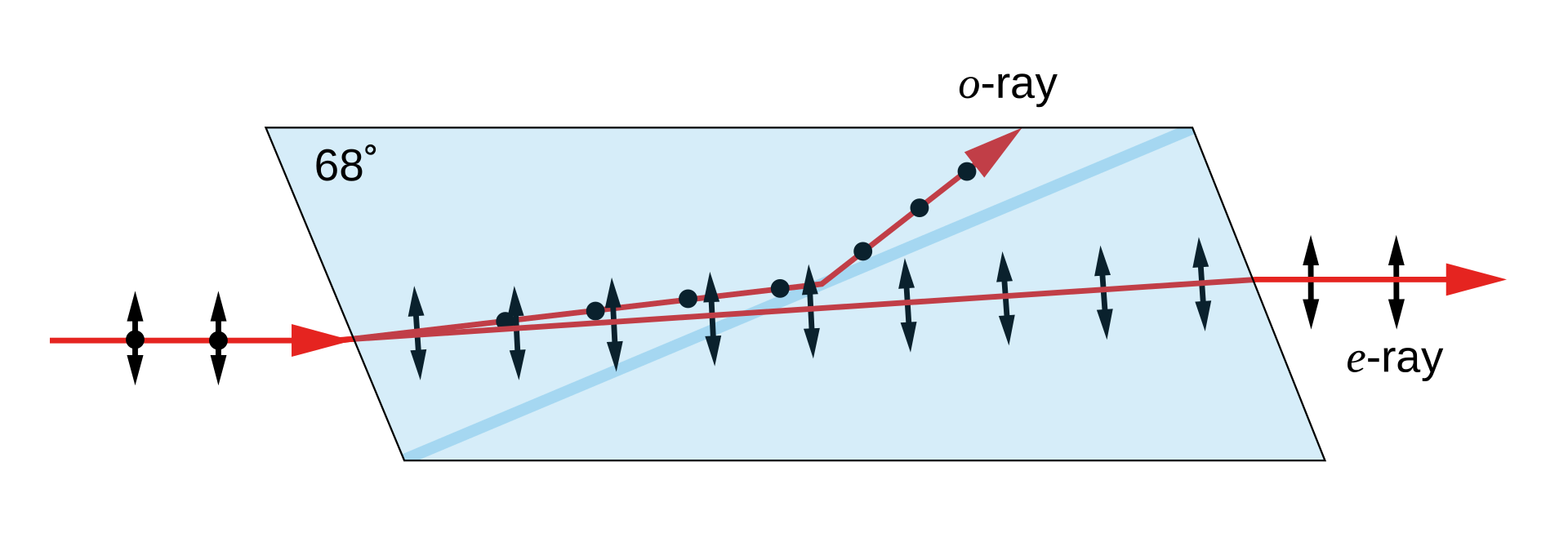 Here the action of the prism is based on the principle of total internal reflection, in which light going from a denser (higher refractive index) medium to a rarer (lower refractive index) medium will be completely reflected if incident beyond a certain critical angle. Remember that I said that the effective refractive index of a medium depends on polarization in a crystal? In a Nicol prism, the “ordinary” ray gets refracted at the entrance surface beyond the angle of total internal reflection, causing it to get completely reflected out of the path of light, leaving only the polarized “extraordinary” ray to be transmitted.