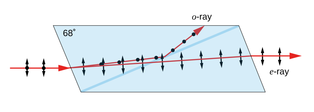 The preliminary explanation of this phenomenon came from none other than Thomas Young, who in 1817 penned a letter to Francois Arago speculating that light is a transverse wave. In other words, whatever is “waving” in light is waving perpendicular to the direction that the light is traveling. We can always choose two distinct directions perpendicular to a wave direction — for example, if we label perpendicular coordinate axes in three-dimensional space as x, y, z, and we take the wave traveling in the z-direction, we can have distinct transverse wave oscillations along x and y. Natural light, from the sun or candles or light bulbs, is “unpolarized,” meaning that it tends to be a random, rapidly-changing combination of x- and y- oscillations. Each of these “polarizations” of light is refracted differently when passing through the crystal, in a phenomenon known as “anisotropy,” and this results most of the time in two images whenever one looks through the crystal. Why did Malus only see one in reflection? We’ll come back to that in a minute…