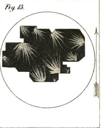 One more figure is worth sharing here, just for its beauty: Herapath had difficulty trying to get one single sheet of his new material to act as a large polarizer; however, he was able to clump together multiples on a microscope stage on top of a slab of tourmaline, acting as a polarizer itself, and see lovely patterns due to the various orientations of the crystals: