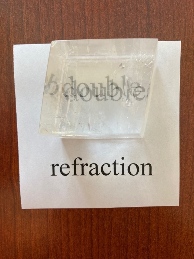 But how did we discover polarization at all? This brings us to the first key ingredient of the Nicol prism — the material optical calcite. In the 1800s, the only known source of it was Iceland, so it is also known as Iceland spar. Researchers at the time were baffled by the observation that two images are formed when looking through a sample of calcite, as shown below.
