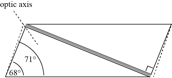 As I understand it, calcite naturally forms a rhomboid with an angle of 71 degrees; the ends must be cut down to 68 degrees. The crystal is then sliced diagonally so that the two pieces are right-angled triangles, and then they are glued back together using Canada balsam (the grey in my image). Let me come back to what the “optic axis” is in a moment.