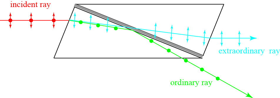 I actually worked through the geometrical optics to get the angles right — mostly. I didn’t bother calculating the refraction of the ordinary ray as it leaves the prism, and I didn’t bother to calculate the slight bit of refraction that will happen to the extraordinary ray as it passes through the thin layer of Canada balsam. Otherwise, you can see what happens: an unpolarized light ray (in red) breaks up into up-down (blue) and left-right (green) polarized rays upon entering the crystal, via double refraction. The ordinary ray gets completely reflected at the balsam layer, while the extraordinary ray gets (mostly) transmitted.