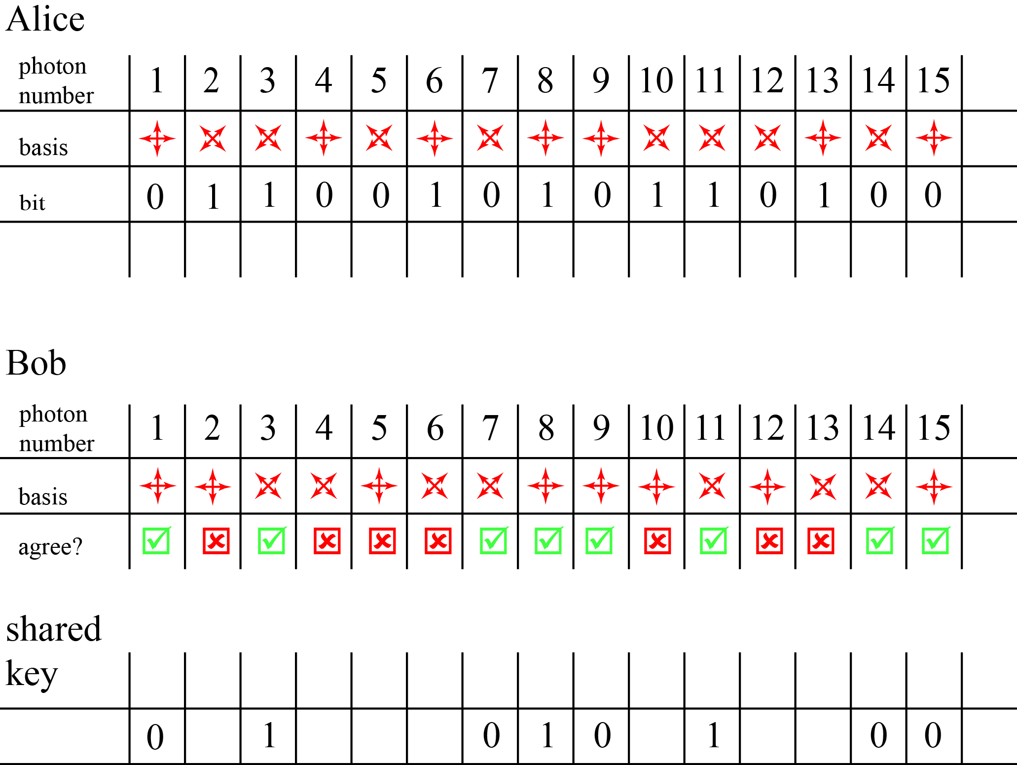 After tallying his data, Bob publicly sends Alice the sequence of measurements that he made on the photons. Alice tells him which of those measurements were in agreement with hers. Alice and Bob know that they have the same binary data for each of those coincident measurements, and that binary data becomes their cryptographic key. The information for every photon that they measured in a different way is discarded. This process is illustrated below for a small sequence of photons.