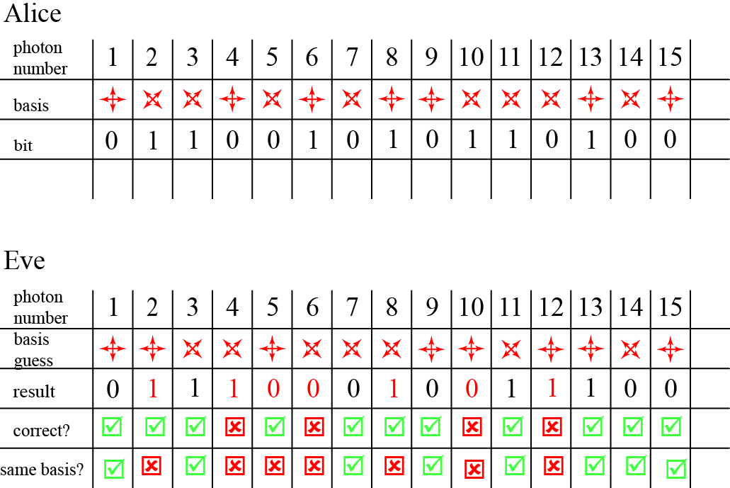 But it goes even further. Because Eve’s measurements change the basis for about 50% of the photons she intercepts, Bob will have disagreements between his results and Alice’s results, even when they compare notes and determine that they were using the same basis. To check for eavesdropping, Alice and Bob take some fraction of the bits where they use the same basis and publicly compare the actual bits. If there is eavesdropping, they will find that their results have significant disagreement and they can terminate the communication attempt before sending an actual message. (These extra bits, whose values are publicly shared, are only used for error checking and not included in the actual key.)
