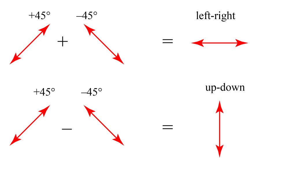 In other words, up-down plus left-right equals plus 45, while up-down minus left-right equals minus 45. (I won’t go through the details of the math that leads us to conclude this, we’ll just leave it as intuitively reasonable as this is most of what we need for this post.)