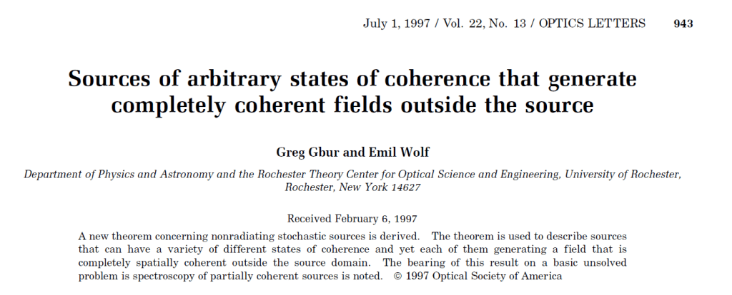 But it also led to another interesting implication: if our coherent mode representation includes one radiating mode and a large number of nonradiating modes, then the source will be quite incoherent but the radiated field will be fully coherent. This was quite surprising and unexpected, and Emil was very happy about this result. It led to the title of the paper, “Sources of arbitrary states of coherence that generate completely coherent fields outside the source.”