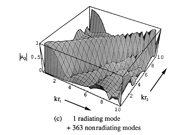 That narrow ridge running across the middle of the plot indicates that the source only possesses correlations when the two points r1 and r2 are very close to each other, which is the characteristic of a very incoherent source. There is a limit to how incoherent a source can be and still be nonradiating, which I would come back to a few years later to demonstrate.