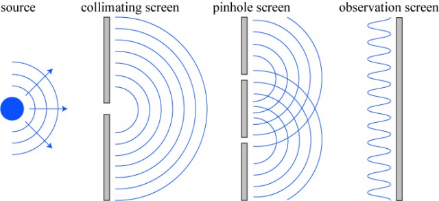A source of light is collimated by a small hole in one screen, and then the light simultaneously illuminates two pinholes in a second screen. Light coming from those two holes propagate to an observation screen, where the waves from the two pinholes interfere with each other and produce bright and dark fringes that look something like this: