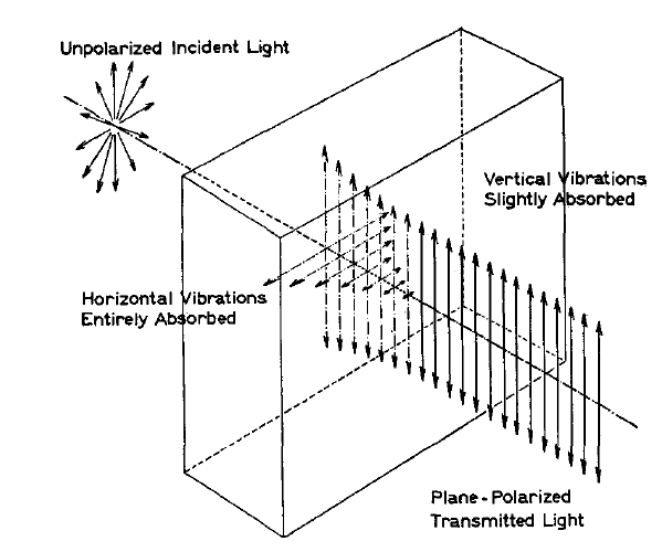 Now let’s briefly talk about how we measure polarization. The standard method is to use a polarizer, which is a device that allows light polarized along one direction to pass unimpeded while fully absorbing light along the perpendicular direction. I particular enjoy this image from a 1938 paper on polarizers.