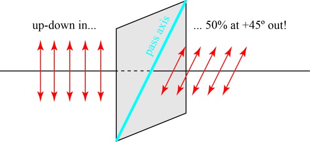 An important part of the interaction of polarized light with a polarizer comes from the previous two images combined. Suppose we send up-down light into a polarizer oriented at 45 degrees. We can say that up-down light is a 50-50 mix of light at +45 and -45, so 50% of the light passes through the polarizer, and what comes out is oriented at 45 degrees.
