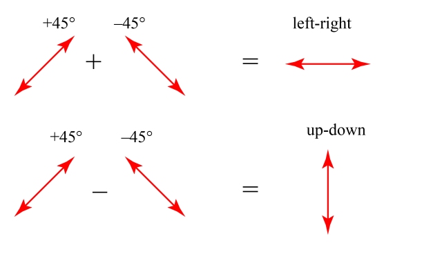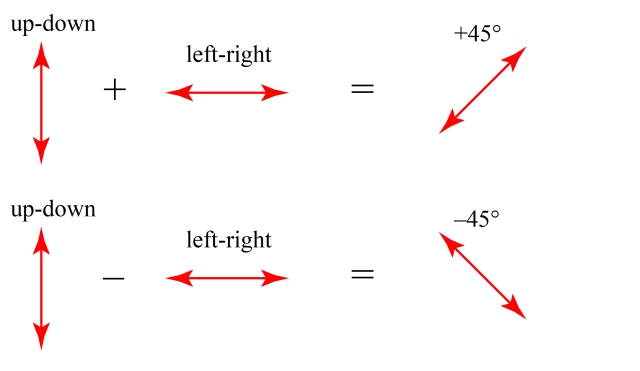 It will be relevant for the discussion going forward to note that any polarization state can be written in terms of any pair of distinct states. For example, polarization at +45 degrees and -45 degrees can be written as combinations of up-down and left-right: