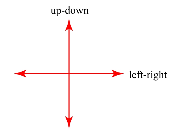 The term “polarization” is of historical origin and refers to the behavior of the electric field. Because the wave is transverse, there are always two distinct ways for the electric field to oscillate for any direction of travel. For example, we can say that the two choices are ‘up-down’ (vertically) and ‘left-right’ (horizontally). As seen when looking head on at the beam of light, these choices would look like: