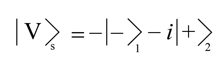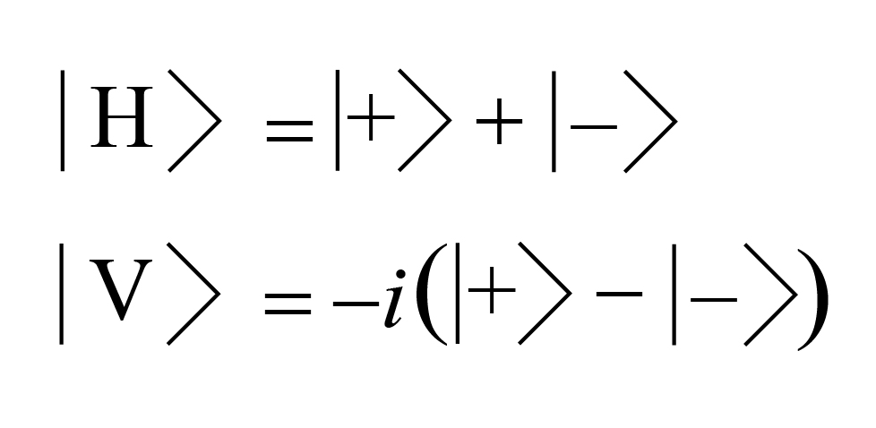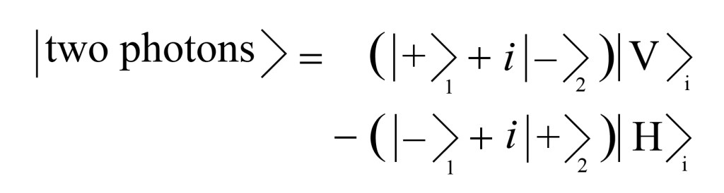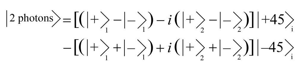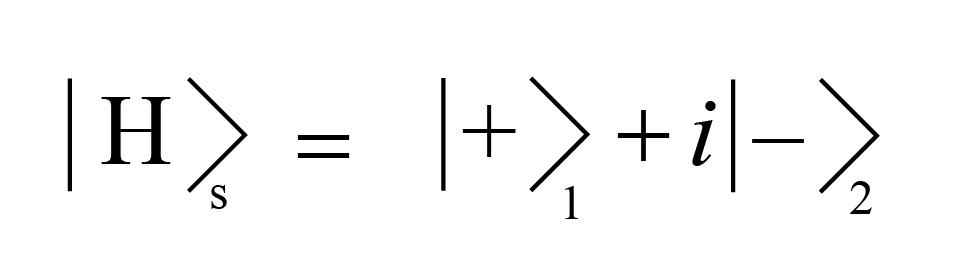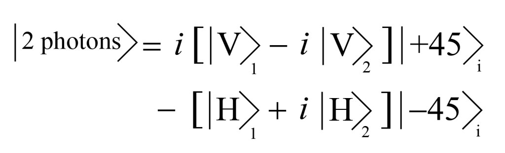 Here, “+” and “-” represent counterclockwise and clockwise circular polarization, respectively, and “1” and “2” represent the slit the photon passed through. The “i” is the imaginary number, i.e. square root of -1. This wavefunction says, in equation form, “a horizontally polarized signal photon will have a + polarization contribution coming from hole 1 and a – contribution coming from hole 2.”