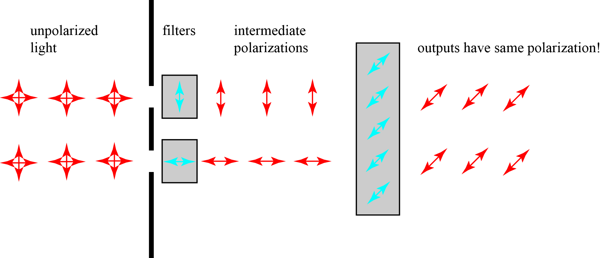This brings us to the trivial quantum eraser. One way to create “which path” information is to place a polarizer in front of each of the pinholes in Young’s experiment, one horizontal, one vertical. This directly correlates the hole that light goes through with the polarization state of the light — because we can measure the polarization of light, we can determine which hole the light went through. In the picture below, I show the “head on” view of the polarization at each location for clarity (much harder to show what everything is doing using an isometric approach).