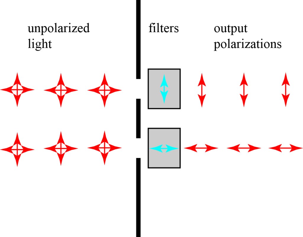 This image shows unpolarized light — light that is a random mixture of horizontal and vertical — passing through a polarizer that absorbs horizontal polarization and allows vertical polarization to pass mostly without reduction.
