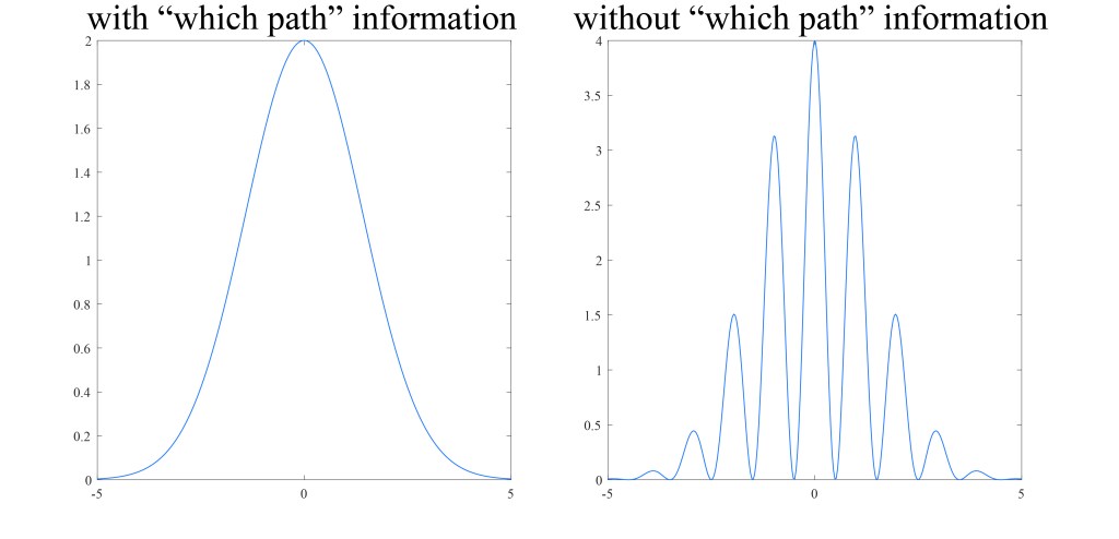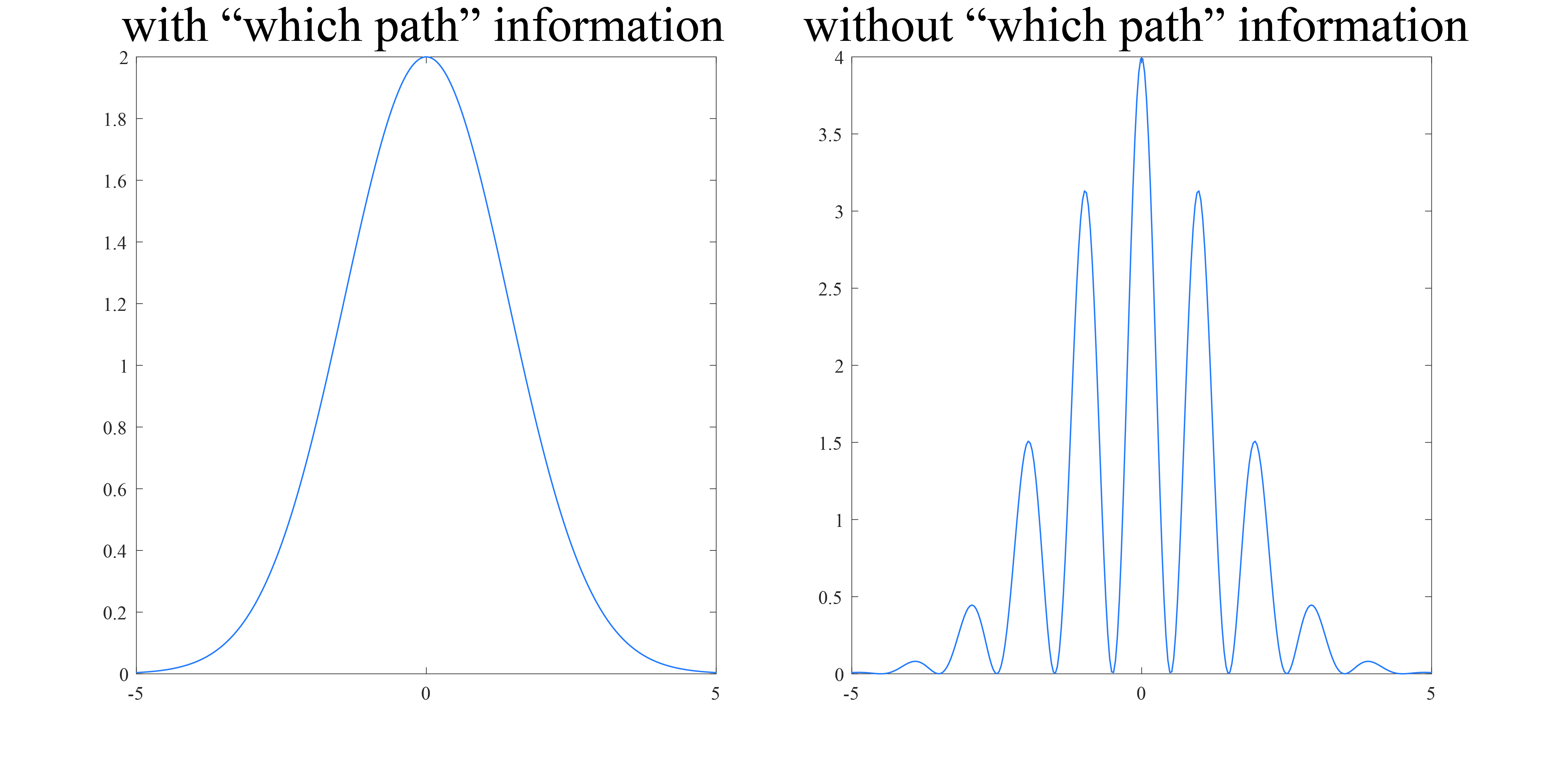 Here is where the idea of “information,” loosely defined, comes into play. The interference pattern for a single photon comes from the recognition that the photon wavefunction passes through both pinholes simultaneously — that is, we as experimental observers have no idea which pinhole the photon has gone through, so it has in a sense gone through both. But if we somehow set up an apparatus that can measure which pinhole the photon has gone through, we will find that the interference pattern disappears completely. Apparently, our knowledge of the path of the photon destroys the interference pattern or, conversely, our ignorance of the path of the photon allows the interference pattern to form.