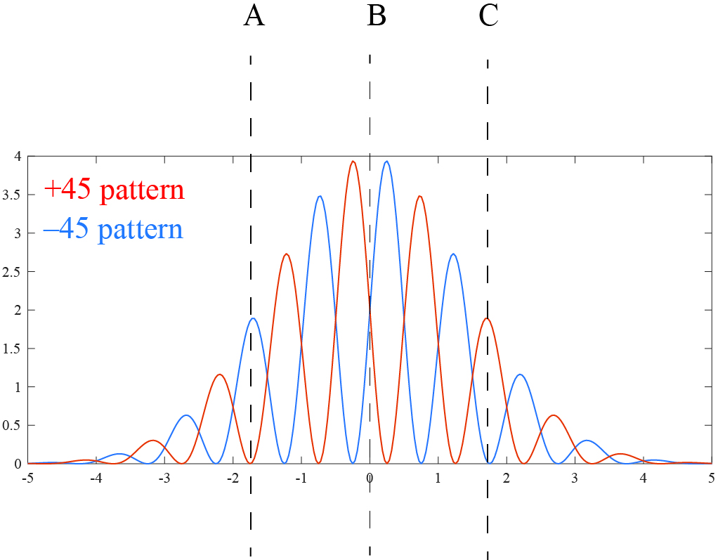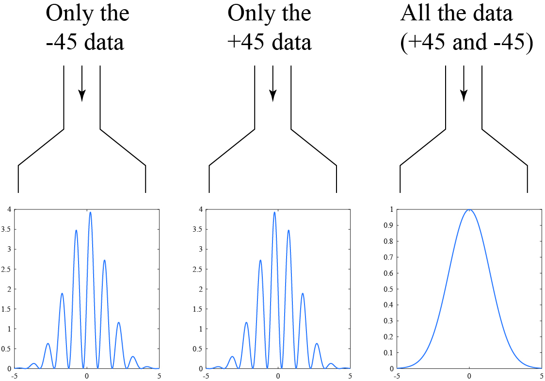 Remember that, before we measure the idler photon state, we expect that the position of the signal photon to conform to the “no interference” pattern, and that this pattern is a combination of the +45 interference pattern and the -45 interference pattern. Now let’s look at those two interference patterns on top of each other.