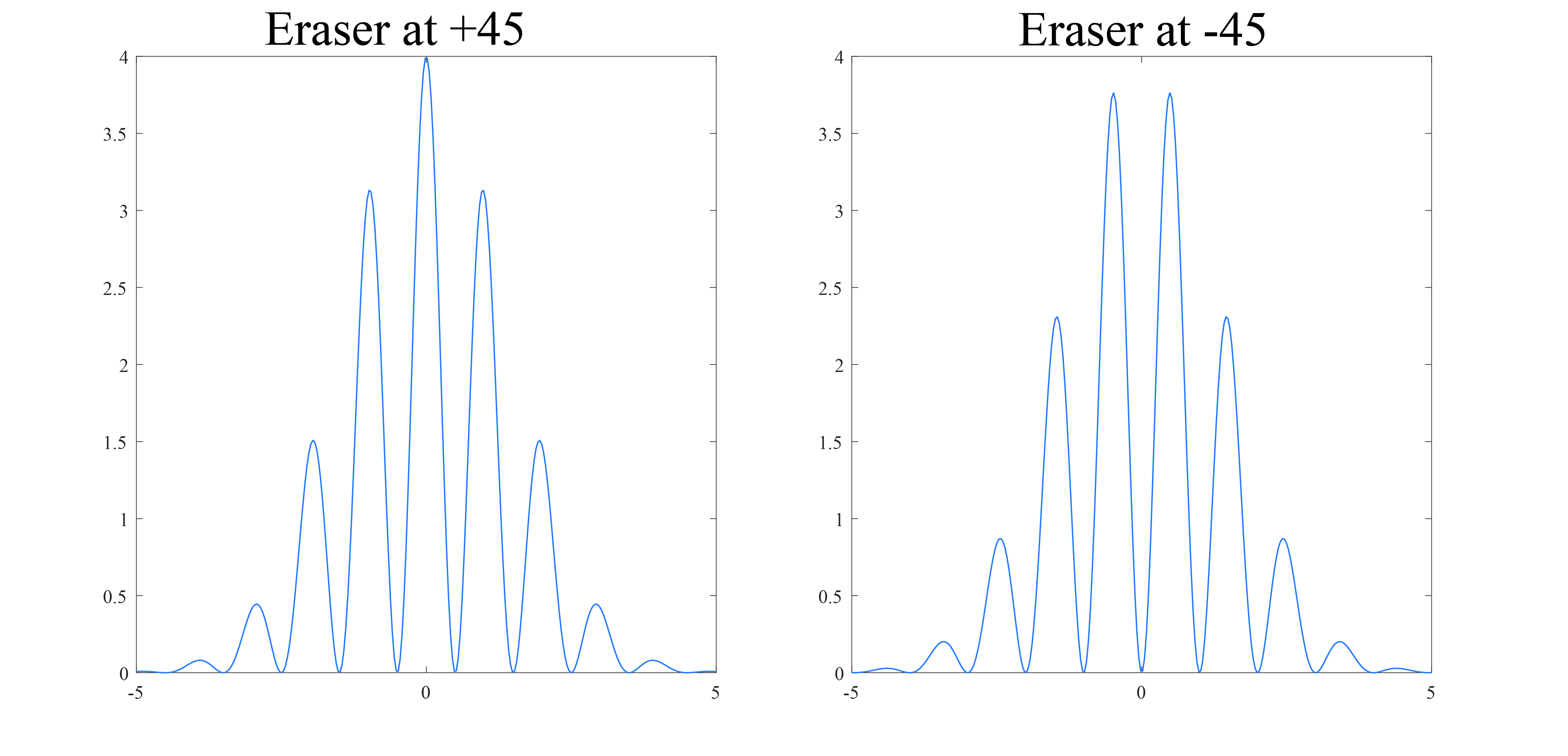 There is one aspect of the trivial eraser that is of huge relevance to a more explicitly quantum case, however. In our above eraser example, we had the second polarizer oriented at +45 degrees to erase the “which path” information. What happens if we orient it at -45 degrees instead? We still get an interference pattern, but it is shifted relative to the first!