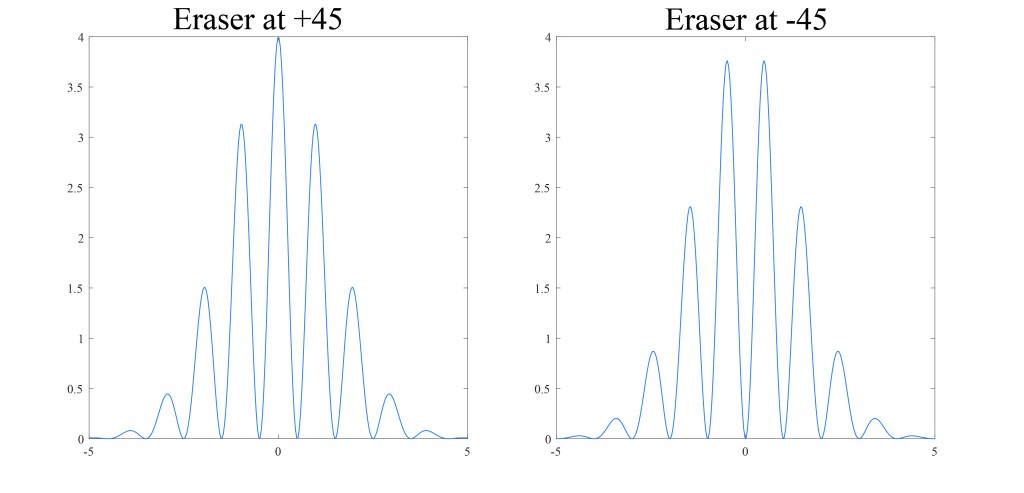 So what can we say is happening here, and how does the eraser work? If we measure the polarization of the idler photon in the H and V orientation, we know for a fact that the signal photon is either V or H polarized going into the slits, respectively, which means they will be perpendicular coming out of the slits and not produce interference. If we measure the polarization of the idler photon in the +45 and -45 orientation, then the state of the signal photon is not well-defined — it can be H(V) entering one slit and V(H) entering the other slit, which means that the filtered outputs of the slits can have the same polarization and cause interference! It would seem, superficially, that we can “erase” the “which path” information by an appropriate orientation of the idler polarizer.