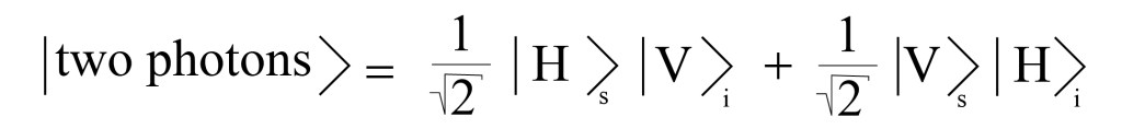 What happens when a photon experiences spontaneous parametric down conversion? Now there are two photons, and a BBO crystal produces photons that are perpendicular to each other. However, nothing forces a particular photon to be horizontal or vertical, so the wavefunction must be a combination of both possibilities. We don’t know the exact state of either photon until we measure one, only that there is a definite relation between them. The combined wavefunction for the two photons becomes