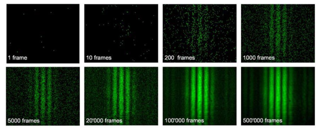 This argument stretches down to the single photon level. In that case, if we send a single photon through Young’s experiment, the probability of seeing the photon arrive at a point on the observation screen is proportional to the interference pattern. That is: the photon is more likely to arrive at some points rather than others due to the wave interference properties of the photon. If we tabulate the positions of a lot of photons over time, we find that the classical wave interference pattern emerges:
