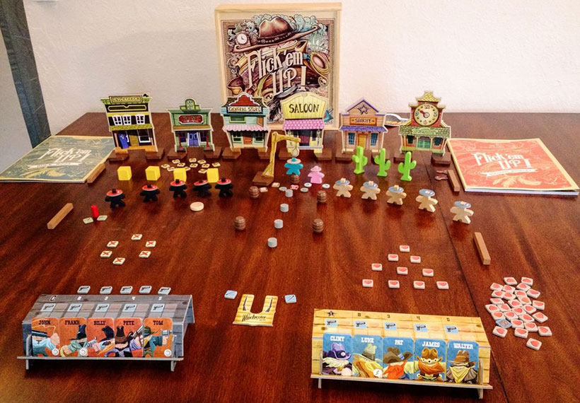 Flick Em Up!: next to try! I haven’t played this one yet with my dad, but I wanted to mention it because I feel like it will be a hit! It is a Wild West shoot ’em up game, where you shoot by literally flicking pieces at your opponent’s gunmen. The game includes multiple scenarios with different rules, and looks to be pretty straightforward to play. For me and my dad, this one is likely to be a success because we tend to flick rolled up straw wrappers at each other when we go out to dinner and have done this for decades — it’s hard to imagine we won’t enjoy doing it with some rules behind it.
