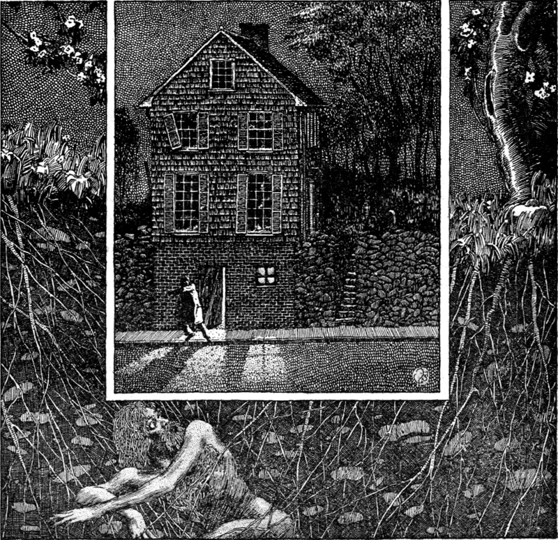 Negotium Perambulans, by E.F. Benson (1922). A man returns to his childhood village, intrigued by the stories of a monstrous creature that haunts one of the houses in town. When he learns that an old friend, an artist, has taken up residence in the house, he has an opportunity to experience the horrors it contains first-hand.