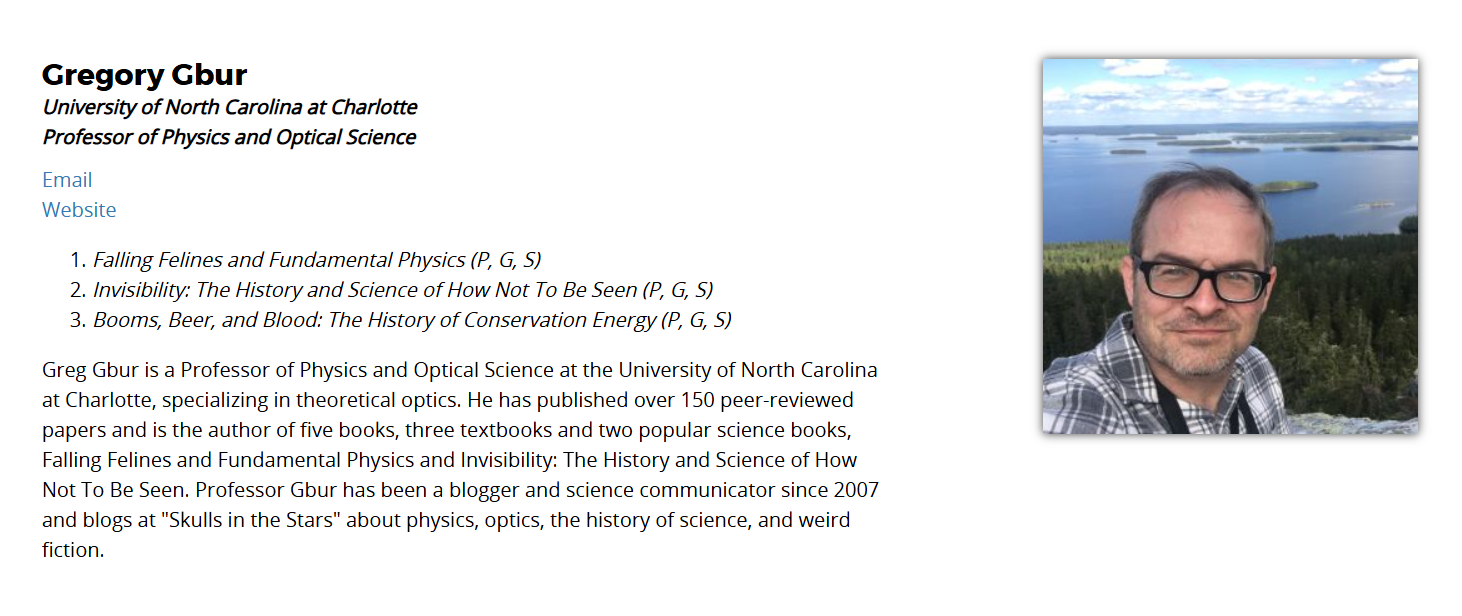 The Distinguished Lecturer Program selects a number of lecturers every year who can be invited to speak at Sigma Xi Chapters, and I offered to talk about two of my classic broad appeal topics — falling cats and invisibility — as well as one I’ve been working on for a while: the history of conservation of energy in physics.