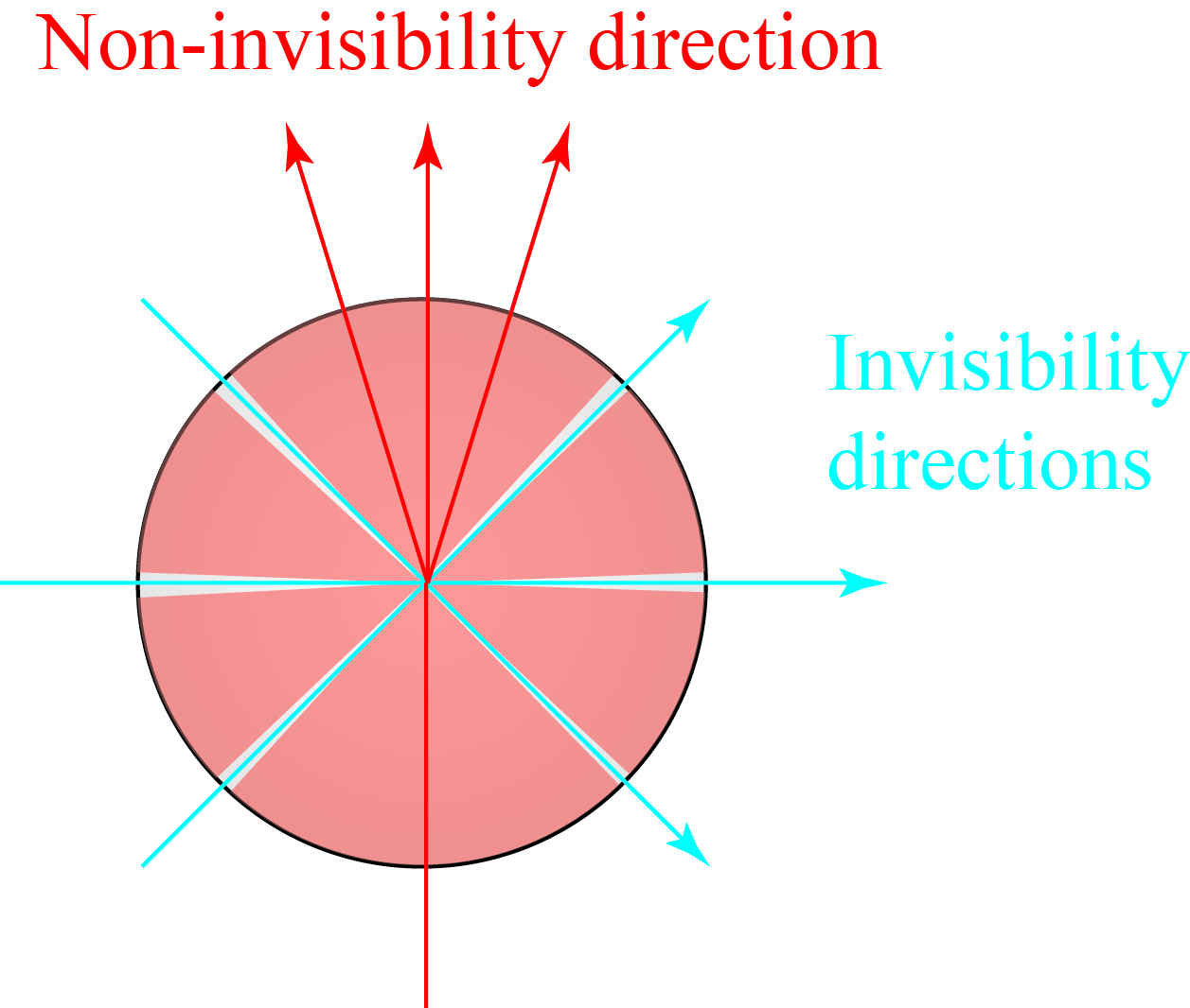 The basic principle is illustrated — crudely — below, for an imagined object that is designed to be invisible from three specific directions. If we illuminate from any of those three directions, the light passes through the object and carries on as if it had encountered nothing. If we illuminate from any other direction — passing through the red regions — the light will be scattered and the object detectable.